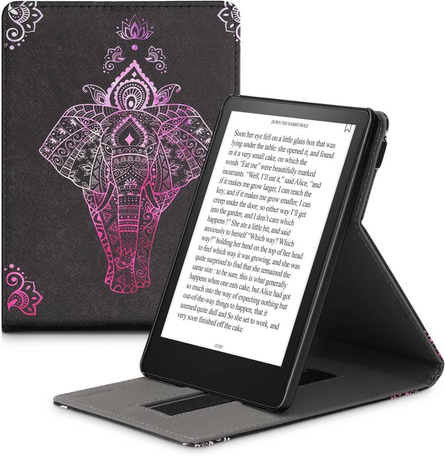Kvalitní pouzdro pro čtečku knih Amazon Kindle Paperwhite 5 (2021). Obal typu Durable Lock nabízí pevné uchycení v plastové vaničce, potažené jemnou umělou kůží s povrchem z mikrovlákna. S touto povrchovou úpravou je pouzdro dobře omyvatelné a především netrpí na olupování nebo trhání koženého povrchu. Obal se příjemně drží a neklouže v ruce. Výběr je z mnoha motivů a barev. Tato varianta je v motivu Elephant Sketch, kombinace více barev. Pouzdro je tenké, pevné, se zavíracím mechanismem pomocí gumového pásku. Má kvalitní povrchovou úpravu z mikrovlákna, která se dobře udržuje. Zároveň jsou přístupné všechny ovládací prvky, čtečku tedy není nutné vyndávat z pouzdra.